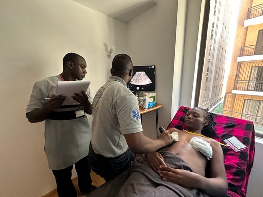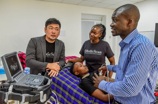 超音波検査のトレーニングについてケニアの医師と話すAAHD・原(左)=ケニア・キアンブ郡、中野智明氏撮影朝日新聞 withPlanet(https://www.asahi.com/withplanet/article/15209927)より