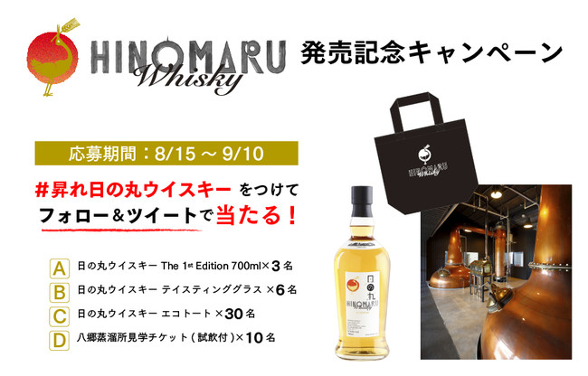 ・日の丸ウイスキーの公式Twitter(@hinomaruwhisky)をフォローの上、ハッシュタグ「#昇れ日の丸ウイスキー」をつけて、日の丸ウイスキーへの応援コメントや感想などのツイートを投稿すると、日の丸ウイスキー The 1st Edition ほか、日の丸ウイスキーのグッズが抽選で当たります。