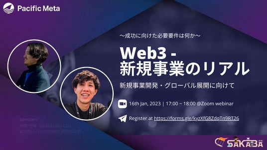 また2024年1月16日にWeb3領域での事業立ち上げをしたい方向けのWebセミナーの開催が決定しました。本ウェビナー「Web3業界の新規事業のリアル ~新規事業の必要要件とは~」ではWeb3業界で新規事業を立ち上げるメリットと、成功に向けて取るべきステップについて、Web3業界での0からの事業立ち上げ経験者からのリアルな洞察を提供します。Web3業界での起業経験があるSakaba Labs 代表の神尾守輝とPacific Meta 共同創業者の畝地和人が登壇します。