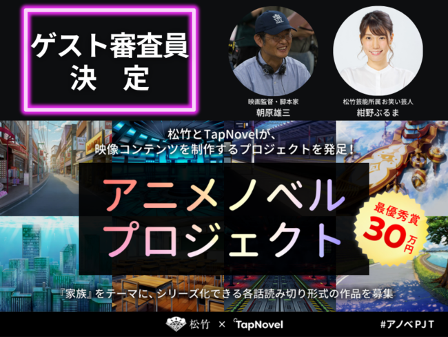 本プロジェクトは、松竹とTapNovelが、TapNovelを用いた映像コンテンツ(アニメノベル)を制作することを目的に、昨年12月に共同で立ち上げ、その取り組みとして、シリーズ化できる各話読み切り形式の作品の原案と、プロジェクトに参加する作家を募集するコンテストを開催しています。