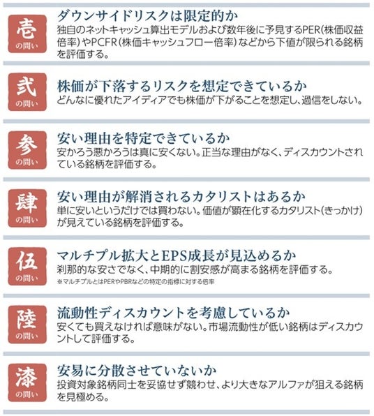 Kaihouは株式市場が気付いていないインサイト(洞察)を得るために発掘、分析のハードルーティンを、「執念」を持って行います。銘柄選定においては長年の投資経験を有する助言担当者の教訓を言語化した「七つの問い」に基づいて各銘柄のアルファを正確に見積もることに集中します。