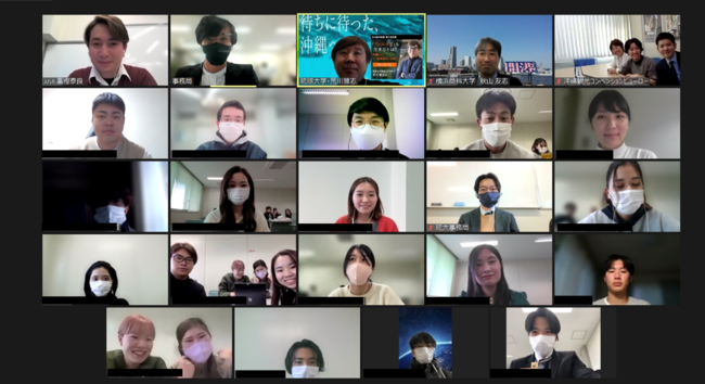 その中で1月19日(木)に実施した、琉球大学と横浜商科大学の共同授業では、学生21名が5グループに分かれて、琉球大学は受入側の視点、横浜商科大学には沖縄を訪れる観光客の視点として、両者の視点でそれぞれのアイデアを発表しました。