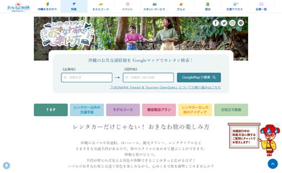 『おきなわ物語』内の特集サイト「レンタカーだけじゃない!おきなわ旅の楽しみ方」において、新しい記事コンテンツ及びモデルコースの開発に加え、チャットボットの導入で、情報発信を更に強化しました。