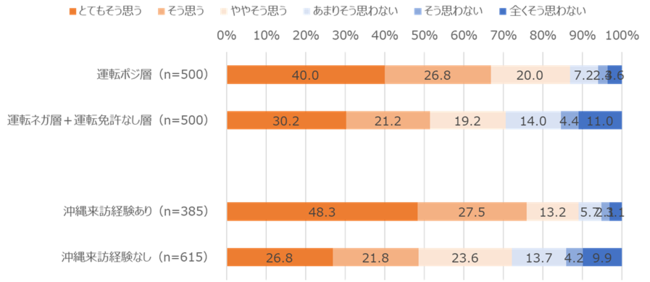 この結果から沖縄県への来訪意欲の高さ、公共交通を利用した沖縄旅行への関心・ニーズの高さがあることが分かりました。今後、沖縄の持続可能な観光地の実現に向けて、レンタカーや公共交通を使った多様な移動手段を組み合わせた沖縄観光の楽しみ方、公共交通を使ったモデルコースの拡充など、新たな沖縄旅行の魅力の情報発信を強化していく必要があると考えております。