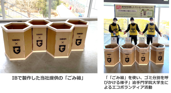 大建工業株式会社(大阪市北区、社長:億田正則)は、SDGsに貢献する活動の一環として、高萩工場で製造する木質繊維板『インシュレーションボード』(以下、IB)で製作した、地球環境にやさしい「ごみ箱」をガンバ大阪へ提供しましたのでお知らせいたします。尚、本「ごみ箱」は、2月25日に行われた「パナソニックスタジアム吹田」でのホーム開幕戦から設置し、「2023明治安田生命J1リーグ」「2023JリーグYBCルヴァンカップ」のホームゲーム開催時の全試合に活用されます。