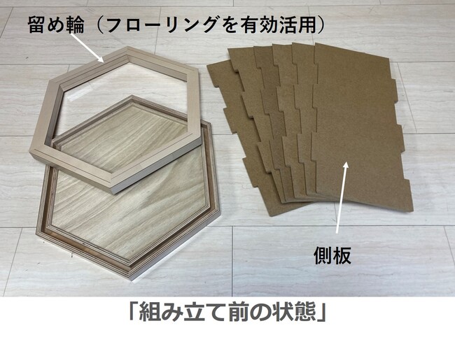 本体の強度や耐久性を考慮し、側板には軽量性と強度のバランスがとれた床下地用IBを使用。形状は、サッカーボールをイメージさせる六角形を採用し、本体正面には当社とガンバ大阪のロゴを焼き印しています。側板を固定する上下の留め輪は、当社が製造するフローリング製品を有効活用して環状に加工し、ジョイント部は釘や接着材を使わず接合・分解ができる組み立て式としました。細部のデザインだけではなく、地球環境にも配慮したこだわりの設計です。