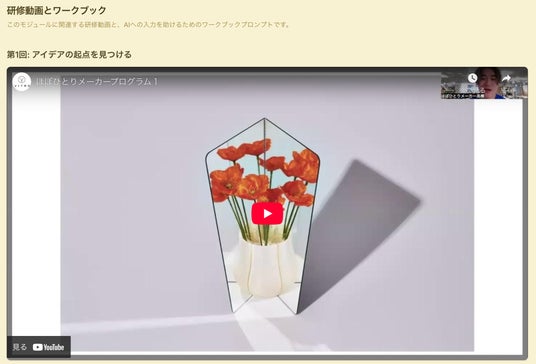 ほぼひとりメーカープログラムの動画による補足と、AIを活用したリサーチや質問集ワークブックも準備。ほぼひとりメーカーAIの活用を促します。