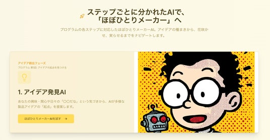アイデアの発想からアイデアの視覚化、試作の作り方、クラウドファンディングをスタートするところまで9つのAIが壁打ち相手としてサポートします。