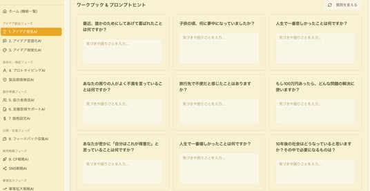 各AIでは、フォーマットに沿って質問や悩み、アイデアを入力すると、生成AIが回答。アイデアを形にすることをサポート。