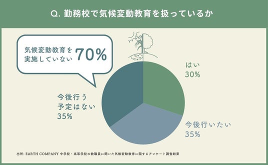 一方で、中学校・高等学校を対象に行なったインターネット調査によると、気候変動教育を実施していない中学校・高等学校は7割にも上りました。別の調査*では、気候変動教育を実施していない理由の上位3つは「気候変動に詳しい教師や講師がいない」「時間の確保が難しい」「適切な教材がない」と、リソース不足によることが判りました。