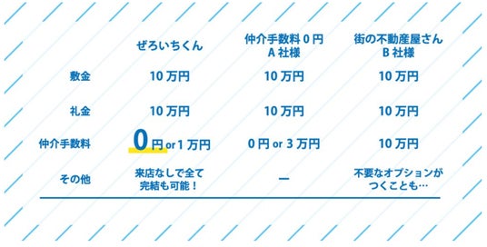 また、仲介手数料とは不動産会社が提供するサービスへの対価にあたる費用となります。たとえば、仲介手数料には物件探しのお手伝いやご提案、大家さんとの連絡、内見の手配などが含まれます。ところが近年の不動産ポータルサイトの普及により、お客様が自分で借りたいお部屋を探せるようになりました。不動産会社が担う仕事は減っているのに、仲介手数料で家賃1ヶ月分をいただくのは「もらいすぎだ」と考え、「ぜろいちくん」を提供しています。