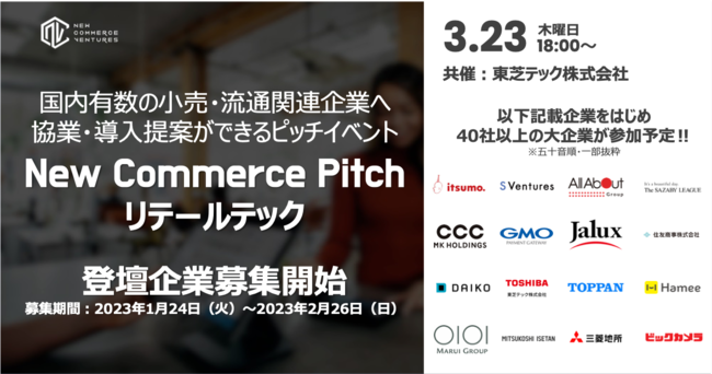 小売・流通のDXを支援するNew Commerce Ventures株式会社(本社:東京都品川区、代表取締役:松山馨太・大久保洸平、以下NCV)は、東芝テック株式会社(本社:東京都品川区、代表取締役:錦織弘信、以下東芝テック)と共催でリテールテック領域のスタートアップと事業会社の協業・導入機会の創出を目的とするピッチイベント『New Commerce Pitch リテールテック』を2023年3月23日に開催します。これに伴い、本日より登壇企業の募集を開始します。