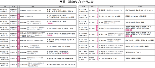 NPO法人全国子どもアドボカシー協議会(所在地:福岡県福岡市中央区、理事長:相澤 仁)は、NPO法人丸亀街づくり研究所「アドボカシー事業所 ここまい」(理事長:合木 啓雄)と共催で、9/9(土)~11/18(土)に香川県内で初めて「子どもアドボカシー講座」を開講いたしました。香川県在住の方だけでなく、全国から基礎・養成講座合わせて延べ100名の方に受講いただきました。