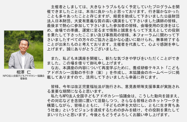 香川県での本講座のプログラムを企画し、トレーナーとしても本講座運営に携わった当協議会 理事長の相澤 仁からのコメントを紹介いたします。