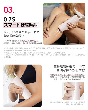 新製品「Ulike Air3桜色」は、使い勝手の良さにこだわりました。従来の製品と比べ、照射効率は114%UPし、ムダ毛ケアの時間は46%短縮できます!特に「AI連続照射モード」を利用することで、指を使わずに(ボタン操作不要で)、簡単に自動照射が可能です。腕や太もも、背中などの広い場所では自動モードを選択することができ、体力を節約しながら、素早くムダ毛ケアを行うことができます。たった20分で全身のムダ毛ケアを完了できるので、照射間の待ち時間が短くストレスフリー!