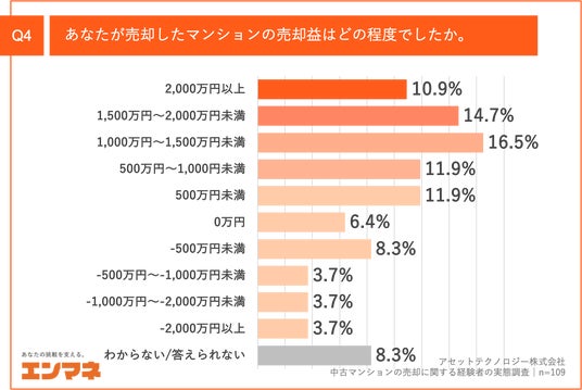 「Q4.あなたが売却したマンションの売却益はどの程度でしたか。」(n=109)と質問したところ、「2,000万円以上」が10.9%、「1,500万円~2,000万円未満」が14.7%、「1,000万円~1,500万円未満」が16.5%という回答となりました。
