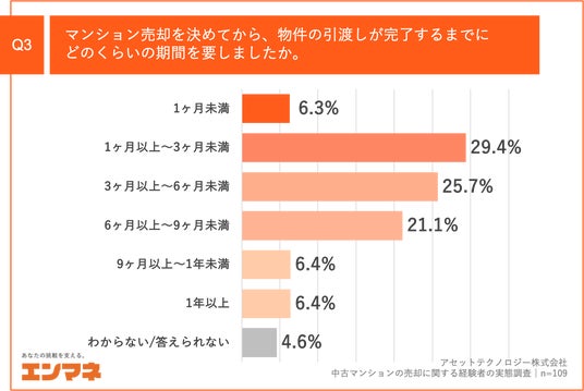 「Q3.マンション売却を決めてから、物件の引渡しが完了するまでにどのくらいの期間を要しましたか。」(n=109)と質問したところ、「1ヶ月未満」6.3%、「1ヶ月以上~3ヶ月未満」が29.4%、「3ヶ月以上~6ヶ月未満」が25.7%という回答となりました。