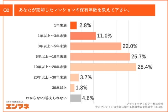 「Q2.あなたが売却したマンションの保有年数を教えて下さい。」(n=109)と質問したところ、「10年以上~20年未満」が28.4%、「5年以上~10年未満」が25.7%という回答となりました。