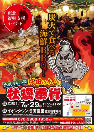 運営は地域活性・復興支援プロジェクト「かき小屋実行委員会」。 イオンタウン成田富里正面駐車場に設けられた特設会場内に、テーブル22卓席88席を用意。テーブルの中央に炭火焼きのコンロを設置し、利用客が自分で食材を焼くBBQスタイルを取っている。