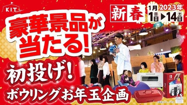 遊びが上手くなる遊び場キスケKIT/屋内型キッズパークKIT PLAYを運営する総合エンターテイメント企業・キスケ株式会社(本社:愛媛県松山市、代表:山路義則)では、2023年1月1日~1月14日に、新春の遊びはじめに、ボウリングにて1ゲーム100点(高校生以上の男性は150点)以上を達成すると、豪華景品が抽選で当たる宝くじを1枚贈呈。宝くじの抽選結果は1月15日~1月31日にKIT店内にて掲載いたします。