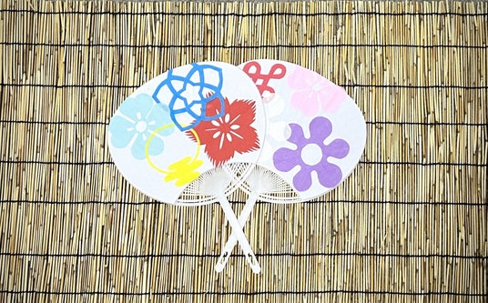 畳んだ紙を切り抜けば、江戸伝統の紋様が広がる。切った図柄を台紙に貼って、オリジナルうちわを作ろう!