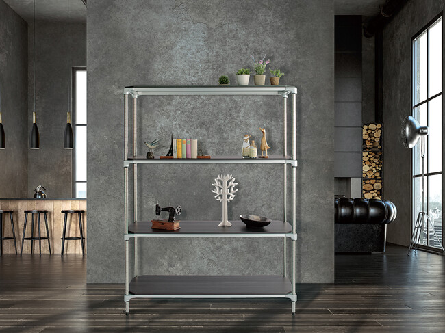その象徴が新たなウッドシェルフです。耐久性に優れ、本物の天然木のように仕上げたメラミンウッド天板。機能美にこだわり、アルミダイカストで作られたコーナー部分。これまでホームエレクターの特徴でもあった異素材の融合を進化させ、ベーシックなインテリアをより一層確立します。