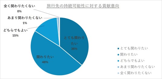 - 旅行先の持続可能性への貢献に対して、84%が「関わりたい」と回答→「とても関わりたい」(36%)、「関わりたい」(48%)