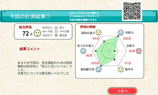 この「運転脳トレ」実施において、「運転脳力チェッカー」は効果測定のための定期的なチェックとして用いることで、より客観的に改善の効果を把握することが可能になると考えます。
