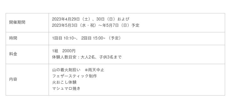 山へ自然の着火剤を拾いに行き、かわいいフェザースティック制作も!最後は自分の起こした焚き火でマシュマロも食べる体験イベント!お一人からファミリー、お友達と誰でも参加できるイベントです。越後湯沢の自然をぜひ体験してください!