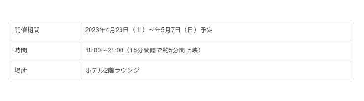 ※プロジェクションマッピングは、他のラウンジイベント開催時は休止いたしますので予めご了承くださいませ。