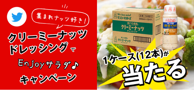ケンコーマヨネーズ株式会社(東京本社:東京都杉並区 代表取締役社長:炭井 孝志)は、日ごろのご愛顧への感謝として本日から当社の公式Twitterにて、当社商品『神戸壱番館(R)クリーミーナッツドレッシング』が当たるフォロー&リツイートキャンペーンを実施します。