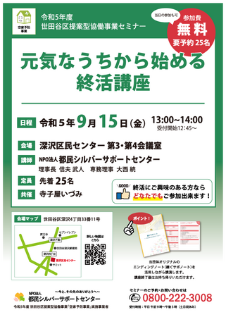 本講座は世田谷区との「令和5年度世田谷区提案型協働事業セミナー」となっており、世田谷区からの助成で運用している講座となっています。