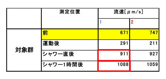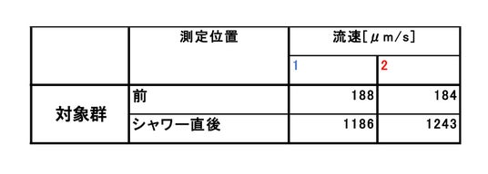 別の被験者ではシャワー前に188μm/sだった血流速度が1188μm/sに変化しました。