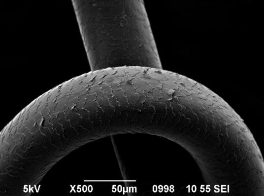 試験例)電子顕微鏡による⽑髪表面撮影サンプル⽑束を40度のお湯に漬け、DETOSPAの水素溶解装置を10分間稼働。