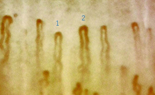 2.20代女性 毎日ワックスとオイルを使用していた方。皮膜毛になっており、白濁しているのは残留オイルやワックス。