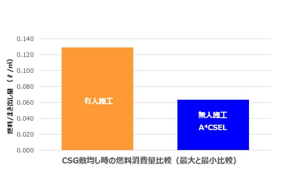 A⁴CSELの導入により、単位時間あたりの打設量の増大、建設機械の走行距離の短縮が実現します。これにより単位生産量に対する燃料使用量が減り、CO2排出量の抑制につながります。成瀬ダム工事における自動運転でのまき出し作業1㎥あたりの燃料使用量を有人運転と比較したところ、約40~50%削減できたことを確認しました。CO2排出量の抑制や燃料費上昇への対応が重要視される現状を鑑みると、上記は労働生産性の向上とともにA⁴CSEL導入の大きな効果と言えます。