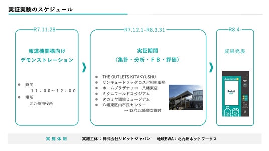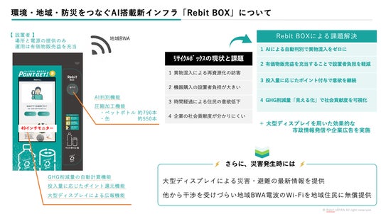 株式会社リビットジャパン(本社:福岡県北九州市、代表取締役:成田 詩歩)は、資源循環を促進する次世代型リサイクルボックス「Rebit BOX」の実証事業を、国家戦略特区に指定されている北九州市にて2025年12月1日より開始します。本事業は、AI判別機能やポイント還元システム、GHG削減量の「見える化」などを通じて、市民の利便性向上と企業の社会貢献度の可視化を実現するものです。
