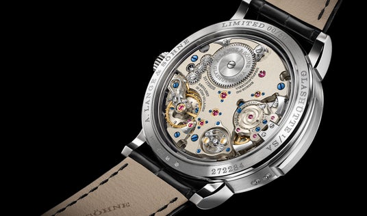 サファイアクリスタル製ケースバックからは、新たに開発されたランゲ自社製キャリバーL122.2の複雑な構造と職人技による高度な仕上げを覗くことができます。手巻きムーブメントを構成する640個のパーツは、たとえ目に見えない位置に配されるパーツだとしても、A.ランゲ&ゾーネならではの仕上げが全てに施されています。美しさのハイライトは、職人がフリーハンドで行うハンドエングレービングが施されたテンプ受けとその上に取り付けられたスワンネック形のバネです。また、側面にある調整用ビスによって、脱進機と調速機の精密な調整が確実となります。素材の特性を生かした洋銀製4分の3プレートには、ブラックロディウム仕上げのエングレービングが施され、四つのビス留め式ゴールドシャトンがグレイン仕上げの表面を飾ります。