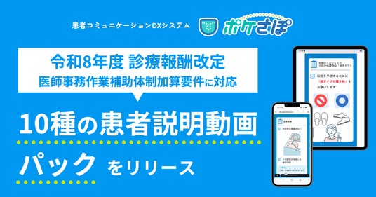 医療機関向け患者コミュニケーションDXシステム「ポケさぽ」を運営する株式会社OPERe(本社:東京都港区、代表取締役:澤田 優香、読み方:オペリ)は、令和8年度の診療報酬改定において新設される、医師事務作業補助体制加算の配置基準緩和(1.3倍換算)に対応した新パッケージ「10種の患者説明動画パック」の提供を開始いたします。