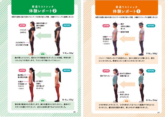 若返りストレッチとは、体に負担をかけることなく、体の各パーツを本来あるべき場所に戻すことで、美姿勢に導くというもの。今回はミドルシニア世代を中心に、運動が苦手な方などどんな方も簡単にできるように、寝っ転がったまま、座ったままでできる難易度の低さが魅力です。