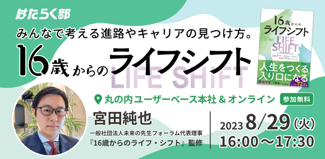 2023年8月9日に発売された『16歳からのライフ・シフト』は、シリーズ累計72万部の「100年人生」の一大ムーブメントを巻き起こした『ライフ・シフト』の待望の高校生版です。監修は、一般社団法人 未来の先生フォーラム代表理事の宮田純也氏。中高生向けキャリア教育を展開する「はたらく部」は、宮田氏と現役高校生とともに、「みんなで考える進路やキャリアの見つけ方。16歳からのライフシフト」を開催します。
