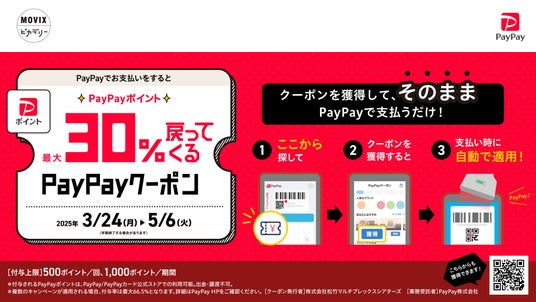 MOVIX京都の飲食売店でPayPayでお支払いをすると、PayPayポイント最大30%戻ってくる「PayPayクーポン」キャンペーンを実施!