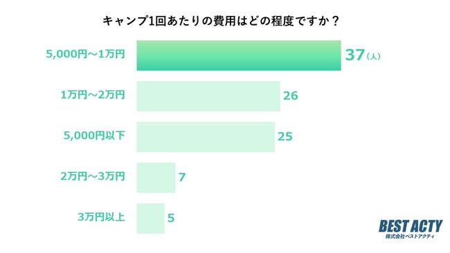 キャンプ1回あたりの費用について100名にアンケートを行ったところ、「5,000円~1万円」と回答する人が最も多い結果となりました。