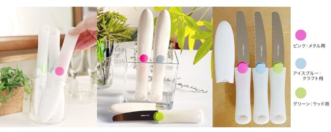 ピンク色のメタル用のこぎりは、硬質素材も楽々カット。グリーンのボタンを持つウッド用のこぎりはDIYやガーデニングに最適で、木材や庭木の切断作業に便利です。アイスブルーのボタンを持つクラフト用のこぎりは、段ボールやペットボトルといった材料の切断に活躍します。DIYのみならず、資源ゴミの回収日にも大活躍してくれますね。