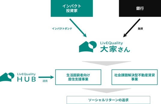 インパクトボンドは、LivEQuality大家さん、NPO法人LivEQuality HUBおよびインパクト投資家を含む様々なステークホルダーが一体となって行うLivEQuality事業に関連して、アフォーダブルハウジングに活用する住宅の取得のための資金調達として発行されます。