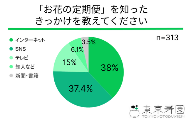 「「お花の定期便」を知ったきっかけを教えてください。」という質問に、「インターネット」と回答した方は38%、「SNS」と回答した方は37.4%、「テレビ」と回答した方は15%、「知人など」と回答した方は6.1%、「新聞・書籍」と回答した方は3.5%という結果がわかりました。