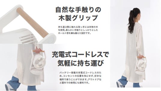 コンセントがない部屋、コンセントが届かない空間でも使えるコードレス機能を搭載。熱気のこもる脱衣所やキッチンでの使用、浴室の湿気対策、アウトドアでの使用など様々な場面で活躍します。大きな木製グリップ付きで持ち運びも便利です。