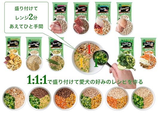 これらを飼い主が愛犬に合わせて選び、1:1:1の比率でブレンド。電子レンジで2分加熱するだけで、飼い主が愛犬のために手作りしたような栄養バランスの良いフードが完成します。