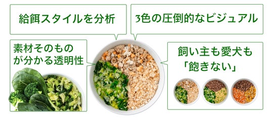 給餌スタイルを分析、3色の圧倒的なビジュアル、素材そのものが分かる透明性、飼い主も愛犬も「飽きない」