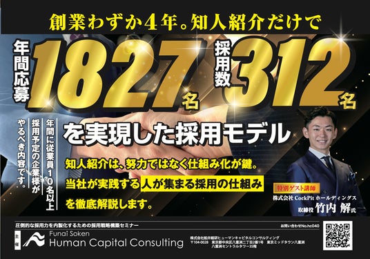 株式会社CockPitホールディングス(本社:東京都港区、代表:鯰江純樹、以下CockPitホールディングス https://cockpit-tokyo.com/)は、株式会社船井総研ヒューマンキャピタルコンサルティング(以下「船井総研HC」)主催により、2026年2月に東京・大阪・Webで特別セミナー「圧倒的な採用力を自社に内製化するための採用戦略構築セミナー」を開催いたします。本講演では、4年で売上10億を達成し、今期売上15億を目指す同社が300名以上をリファラル採用のみで採用してきた秘訣と実践ノウハウを紹介します。